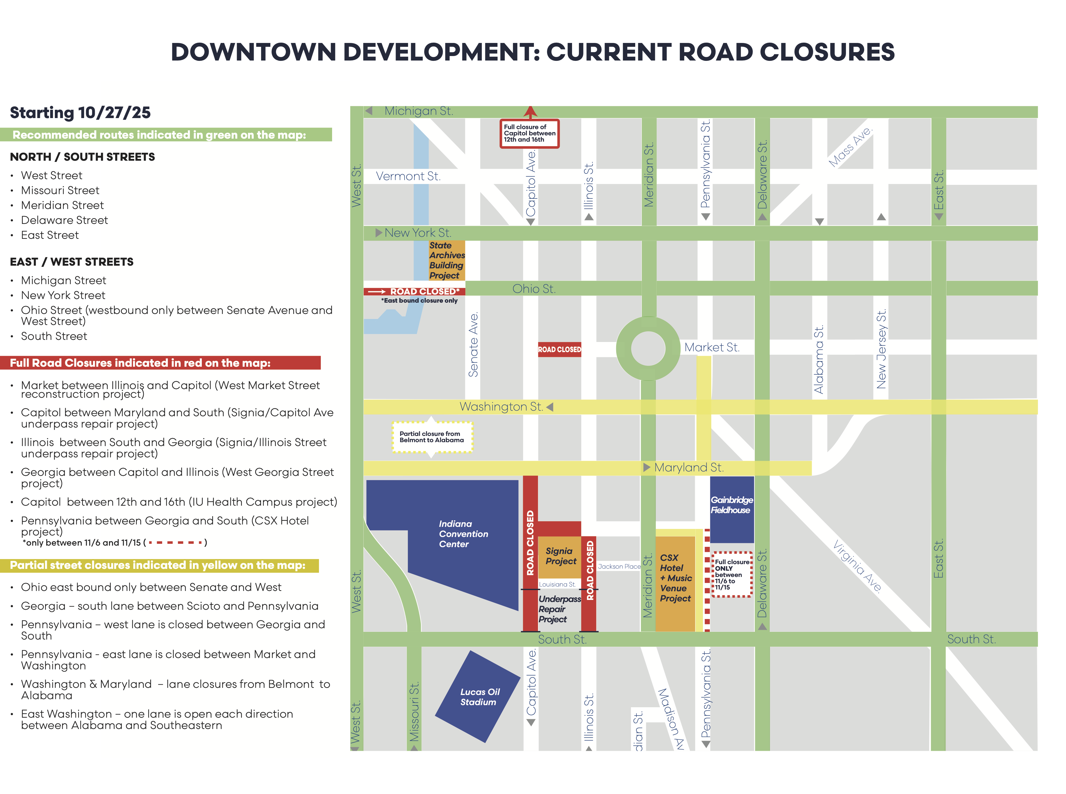 - Full closure of West Market Street from N. Capitol Avenue to N. Illinois Street in effect for 8 weeks starting on October 13