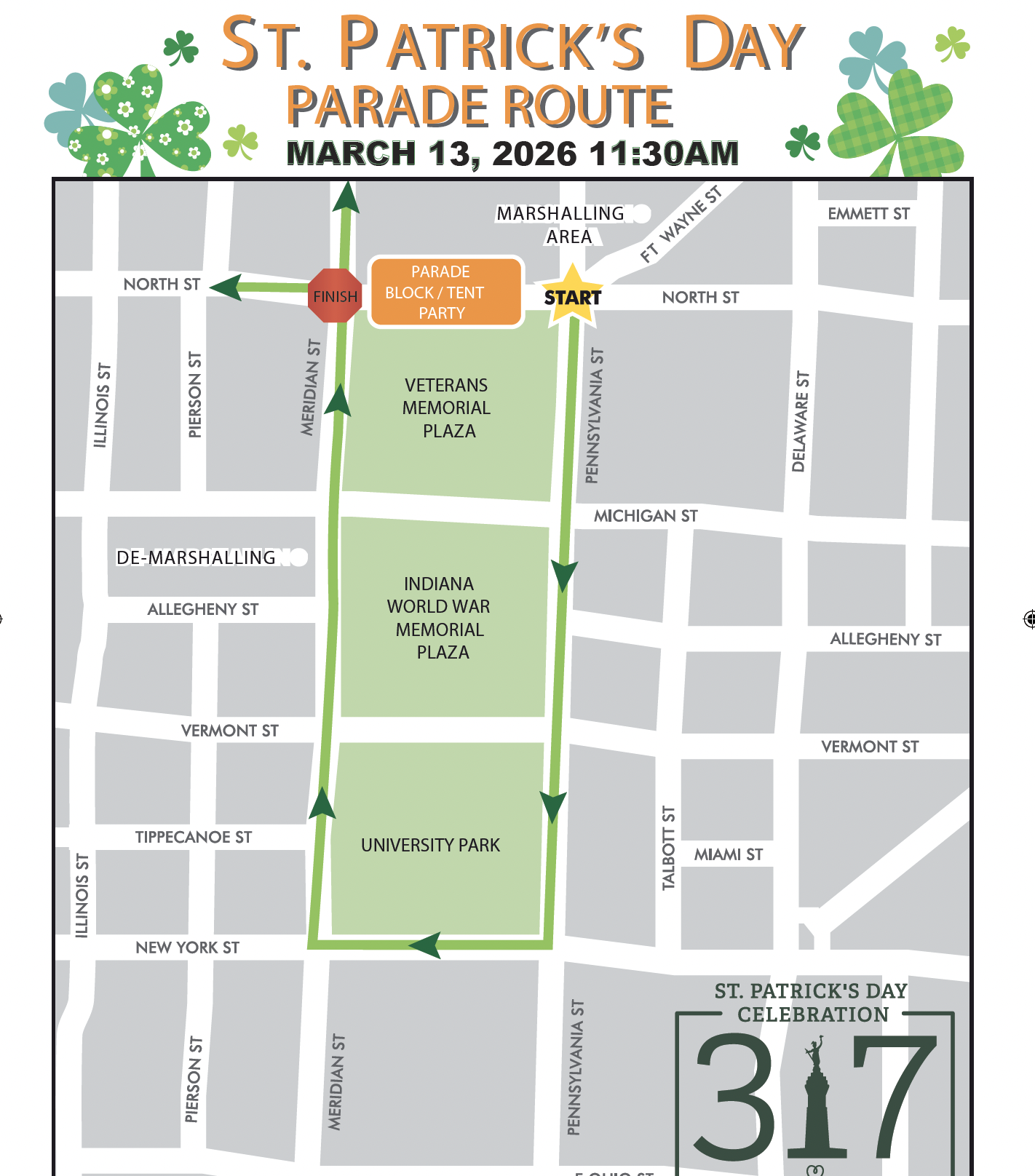 - NEW: Partial closure of New York Street from White River Parkway to Limestone Street will be in effect on March 14 from 1PM to 4PM for the Shamrock 5K Beer Run.