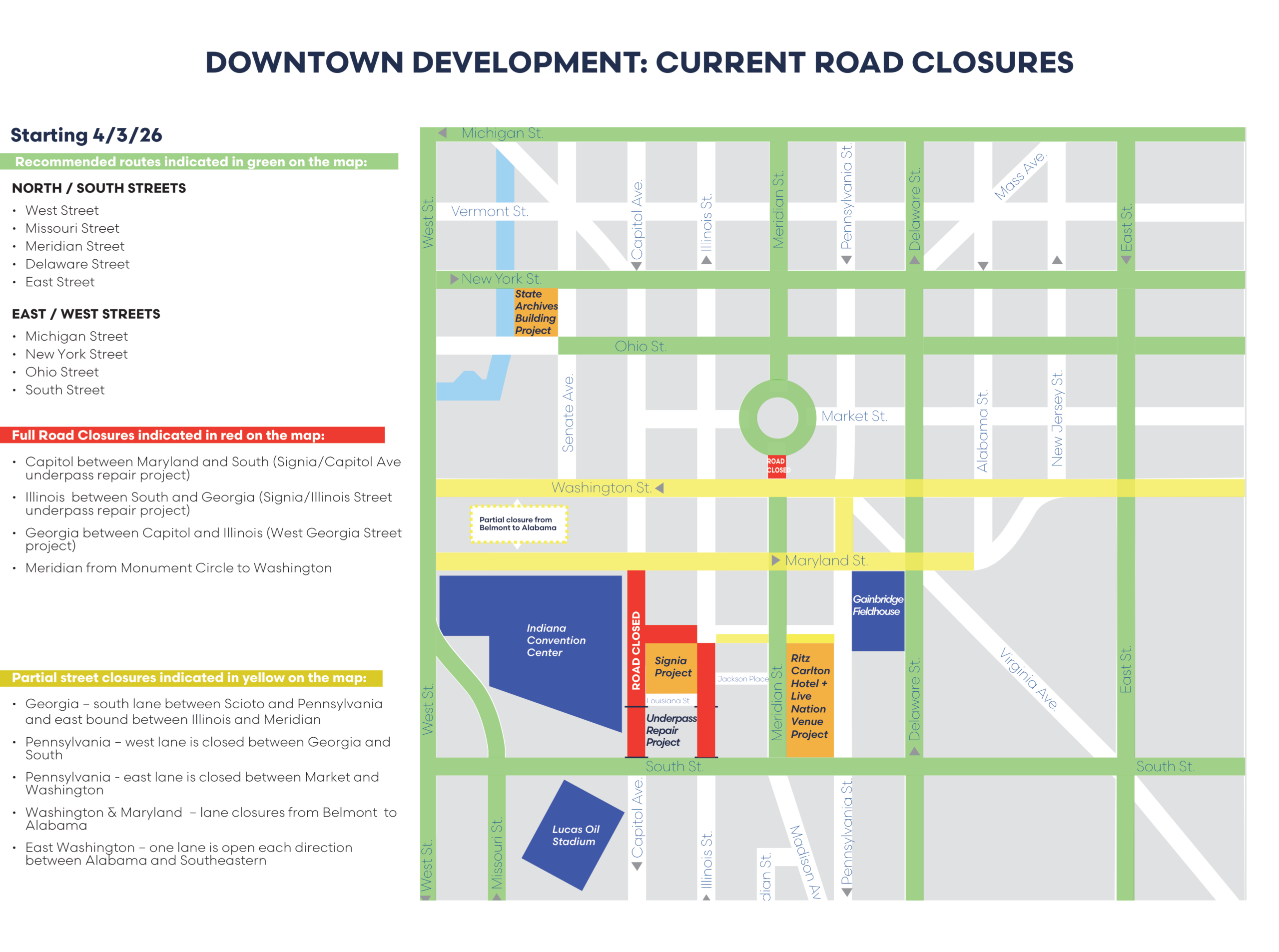 - Total closure of Pennsylvania Street from North Street to New York Street.