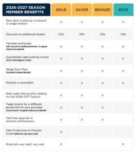 Renewing early guarantees your current seats or allows you to choose an even better one. You’ll also receive the best price now compared to renewing later, a 25% discount on additional tickets for friends and family, discounted valet, and more! Did you know? Being a Season Ticket Member is like seeing 5 shows for the price of 4?